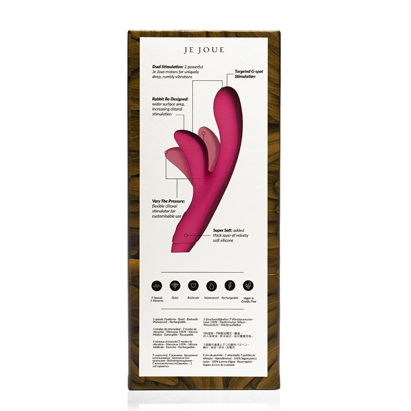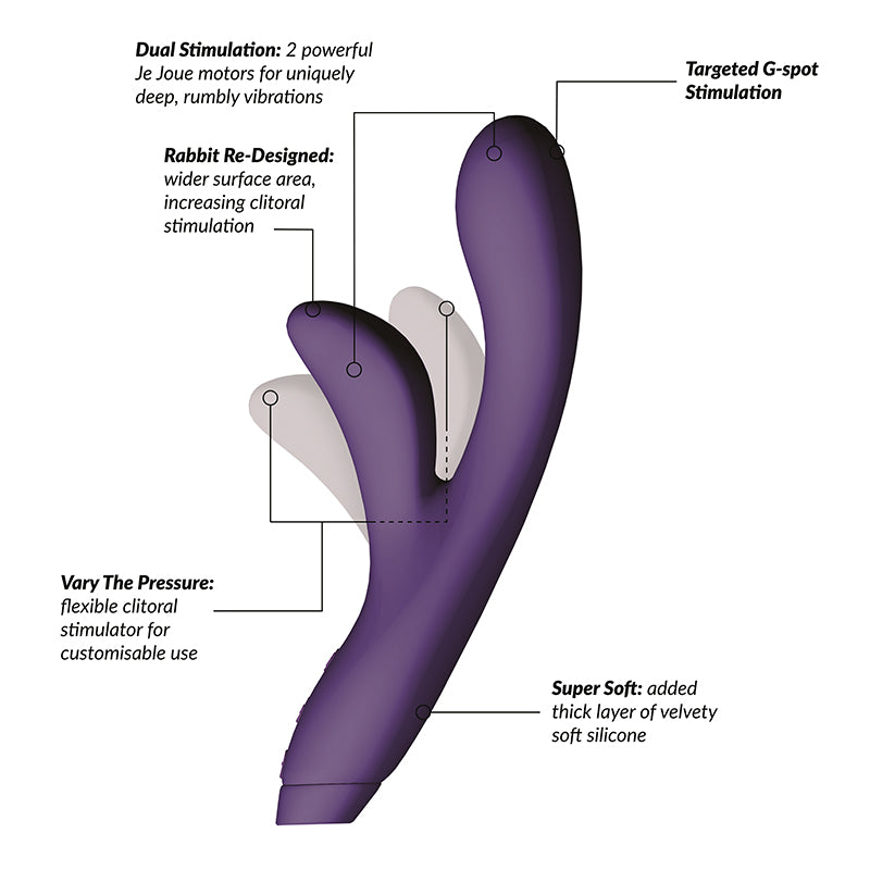 The iconic Rabbit - redesigned for the modern Queen! Hera is the world's softest, sleekest rabbit vibrator. The soft, squishy tip provides deep, rumbly vibrations directly to your G-Spot, while the flexible thumb stimulates more of your external clitoris, for the ultimate blended orgasm. Hera's motor is designed to vibrate at an ultra-low frequency to give our signature Je Joue oh-so-low rumbling vibrations. These vibrations travel further through the body, accessing more internal nerve endings and pleasure points, for a totally mind-blowing, full-body orgasm. With 5 speeds and 7 patterns, Hera offers a wide range of vibrations from a gentle purr to a deep rumble. - USB rechargeable silicone rabbit vibrator for blissful blended orgasms - 5 speeds and 7 patterns for tailored play - Contoured for precision stimulation of your pleasure points - Suitable for both internal and external stimulation - 100% waterproof for easy cleaning and hotter-than-hot baths - 100% Vegan vibrator