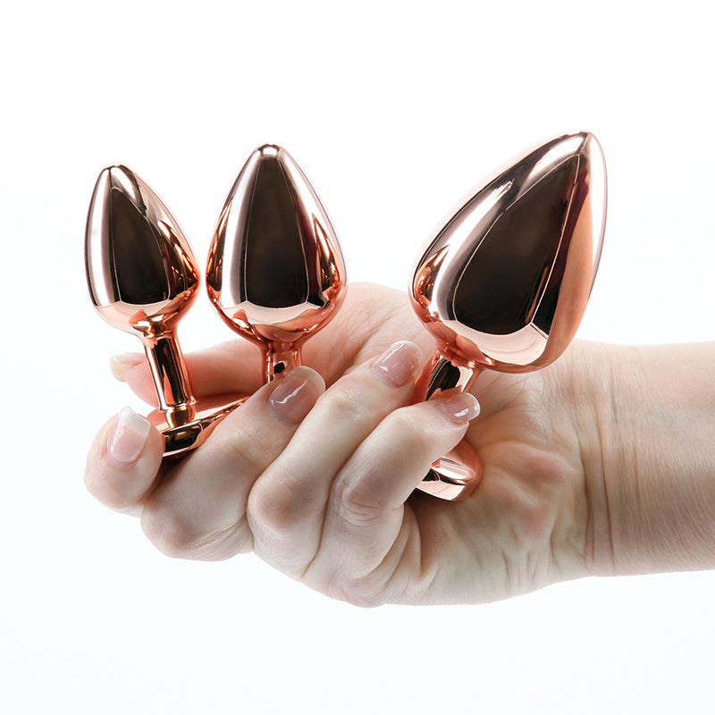 This dazzling trainer kit includes three chrome-plated plugs in graduated sizes, shaped foreffortless penetration. Ideal for training solo or with a partner, these are body safe and available in a variety of colors, shapes, and sizes. Suitable with all lubricants.