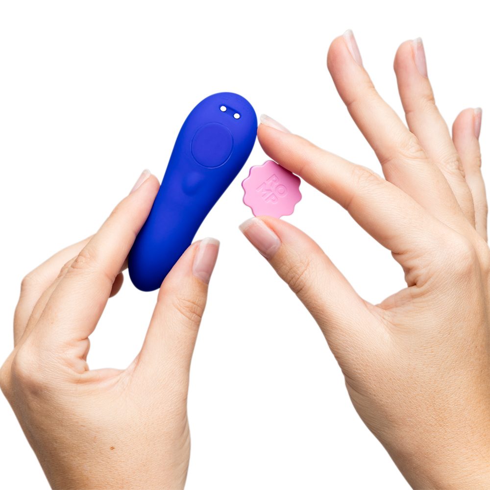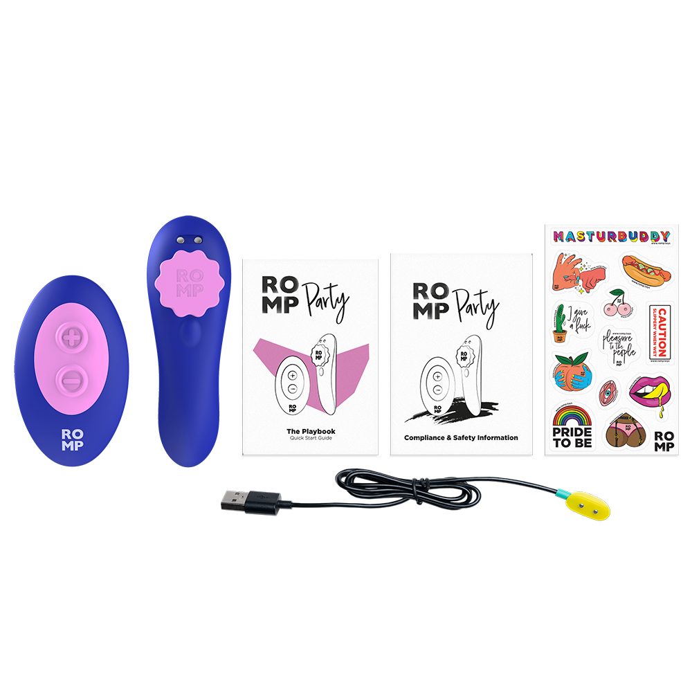 ROMP Party is a remote-controlled panty vibrator designed for on-the-go clitoral stimulation. With 7 intensity levels, this discreet treat easily snaps into place for kinky adventures in solo and partnered play. - Whisper quiet - Near-silent and discreet. - IPX7 waterproof - Always down for a pool party or a bubble bath. - Wearable - Hands-free pleasure wherever you go. - Remote Control - Send good vibes. - Powerful vibrations - Next level vibration strength. - 7 intensity levels - No booty call needed. Panty Party PDF