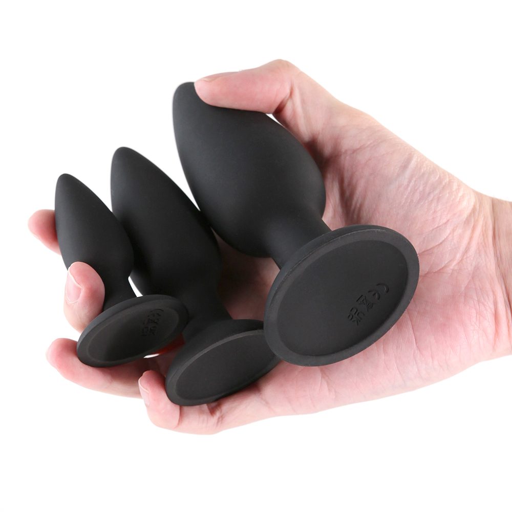 The Triple Strike Kit by Renegade includes three black plugs in graduated sizes with long necks and tapered tips for easy insertion ideal for training solo or with a partner. Made of firm, pliable silicone. Suitable with all lubricants.