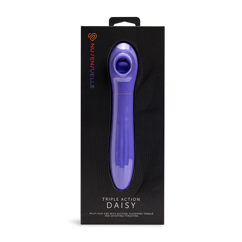 MULTI-PLAY VIBE WITH SUCTION, FLICKERING TONGUE, AND SATISFYING THRUSTING Enjoy multiple titillating sensations with the satisfying Daisy. We took our wildly popular Trinitii and bumped up the erotic potential with the addition of thrusting to simulate a realistic and satisfying sensation. With three speeds and seven modes, the imaginative thrusting component replicates the natural movements of a partner. Daisy also offers seven gentle suction speeds and five flickering tongue modes that can be layered to simulate oral play. The spirited multi-play functionality of suction, flickering tongue, and thrusting delivers the orgasm you deserve. - 7 Suction modes - 5 Flickering tongue speeds - Thrusting: 3 speeds + 7 modes - Fourth button to immediately release the suction - Designed for G-spot and clitoral stimulation - USB rechargeable - Splash proof - Body-safe
