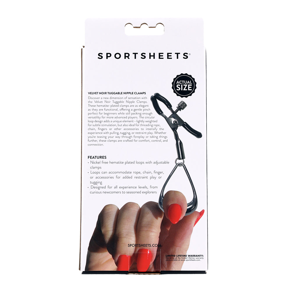 Discover a new dimension of sensation with the Velvet Noir Tuggable Nipple Clamps. These hematite-plated clamps are as elegant as they are functional, offering a gentle pinch perfect for beginners while still packing enough versatility for more advanced players. The circular loop design adds a unique elementlightly weighted for subtle stimulation, but also ideal for threading rope, chain, fingers or other accessories to intensify the experience with pulling, tugging, or restraint play. Whether you're teasing your way through foreplay or taking things further, these clamps are crafted for comfort, control, and connection. Features: - Nickel free hematite with adjustable clamps - Loops can accommodate rope, chain, finger, or accessories for added restraint play and tugging - Designed for all experience levels, from curious newcomers to seasoned explorers Materials: 50% Zinc Alloy, 40% Iron Alloy,10% Silicone Velvet Noir Sales Guide 2025 PDF