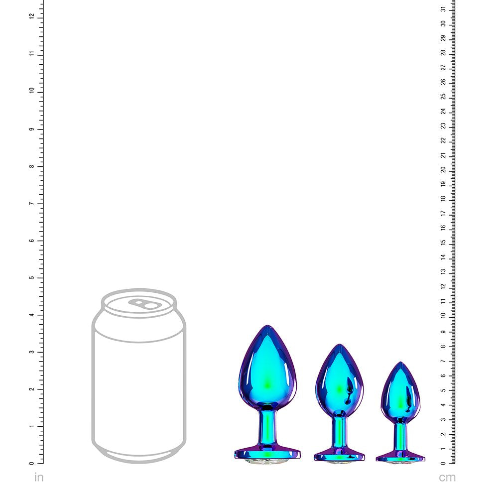 Discover the sophistication of Ouch! International with the Venice Collection 3-Piece Iridescent Plug Set. Featuring a stunning finish and jewel-encrusted bases, these smooth aluminum plugs combine luxury with pleasure. Designed with tapered tips for easy insertion and flared bases for security, they're perfect for solo or shared play. Elevate your sensations with the allure of temperature play and the unmatched elegance of Ouch! International.